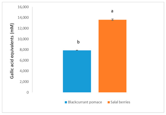 Salal (Gaultheria shallon) is a member of the Ericaceae family which is native to western North America and has been naturalized in some areas of Britain including Scotland [7]. The phytochemical profile of salal fruits has been recently analyzed, and literature indicates the plant is a promising source of polyphenols with anthocyanins and flavonols being the major phenolic components [8]. Small berries such as blackcurrants (Ribes nigrum spp.) are also known to be good sources of polyphenolic compounds including anthocyanins, proanthocyanidins, hydroxybenzoic acids, hydroxycinnamic acids, flavonols, flavanols [9]. Blackcurrant pomace is a major by-product of juice production, which is usually discarded into soil or landfills but could be a promising food ingredient thanks to its high fiber content [10].