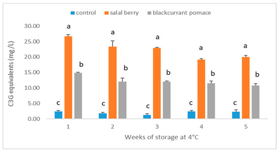 Total anthocyanin content of yogurt beverages during cold storage. Results are presented as means ± SD. Different low case letters denote significant differences at each time point (p < 0.05).