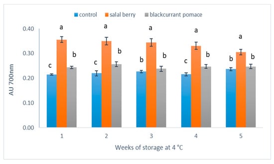 Salal berries and blackcurrants are both good sources of phenolic compounds, especially anthocyanins. Therefore, total anthocyanin and total phenol content of yogurt samples containing salal berries and blackcurrant pomace extract were analyzed during their shelf-life period. As presented in Figure 1, total phenol contents in yogurt beverages containing SB and BC were both higher than the plain yogurt (Control). This effect was significant (p < 0.05) for all storage times, except for week 2 (p = 0.058 for BC and C) and week 5 (p = 0.416 for BC and C, and p = 0.343 for SB and BC). The difference in total phenol content of beverages fortified with fruits extracts (SB > BC) reflects the observed difference between the amounts detected in the fruit’s powders (Figure 2). An increase of total phenols was observed for all yogurts during the first four weeks of storage, which was significant (p < 0.05) for C and BC yogurts. Similar fluctuations in the phenolic content during refrigerated storage has been documented for fruit juices [18,19] and was attributed to the formation of compounds that react with the Folin-Ciocalteu reagent [20]. For instance, proteolysis of milk proteins may release amino acids with phenolic side chains, such as tyrosine, which could contribute to the increase in total phenol content. In addition, metabolism of phenolic compounds by the yogurt cultures may include flavonoid glycoside hydrolysis or C-ring cleavage and the release of simple phenolics such as phenolic acids [21,22]. Following storage for four weeks, total phenol content in yogurt beverage containing SB had a significant reduction, which was similar to other yogurts containing different fruit extracts [4,6,21]. Polyphenols are known to interact with milk proteins and form insoluble complexes which reduce the total free polyphenol content [23]. However, significant levels of polyphenols were detected even after five weeks of storage.