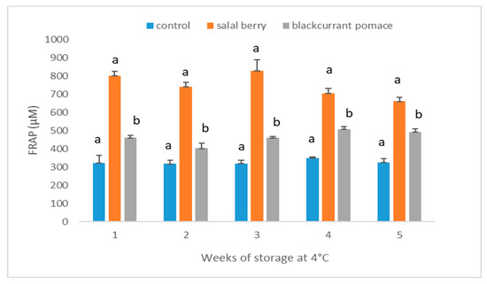 FRAP (ferric reducing antioxidant power) assay of different yogurt beverages. Results are presented as means ± SD. Different low case letters denote significant differences at each time point (p < 0.05).