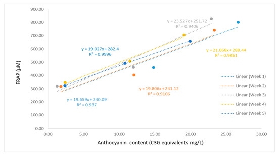 The FRAP assay measures total electron transfer and in combination with other methods can be useful for distinguishing dominant mechanisms with different antioxidants [27]. FRAP assay measures the ability of antioxidants to reduce ferric (Fe3+) to ferrous (Fe2+) ion at low pH through the donation of an electron. Although the results generated by the FRAP assay are not mechanistically or physiologically relevant, it is widely used for in vitro experiments thanks to its robustness and convenience. In agreement to the results of the FRP assay, the yogurt beverage containing SB showed stronger FRAP antioxidant potential than the other samples (Figure 6). Storage time throughout 4 weeks had significant effects on FRAP antioxidant potential of the yogurt beverage containing SB (p = 0.007 between week 1 and 4); however, the same trend was not observed for the other two samples. After storage for four weeks the FRAP antioxidant potential of the yogurt containing SB reduced by around 18%, whereas the plain and BC yogurts showed no significant change. Ashwani and Lawin reported that the decrease in antioxidant activity of yogurts fortified with fruit extract were attributed to the loss of anthocyanin activity [29,30]. The decrease of FRAP antioxidant potential of the yogurt beverage containing SB may be due to the decrease in the anthocyanin content (Figure 7), which is more profound for the samples supplemented with the SB extract (Figure 3).