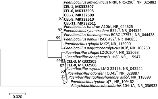 - Nelson, D.M.; Glawe, A.J.; Labeda, D.P.; Cann, I.K.O.; Mackie, R.I. Paenibacillus tundrae sp. nov. and Paenibacillus xylanexedens sp. nov., psychrotolerant, xylan-degrading bacteria from Alaskan tundra. Int. J. Syst. Evol. Microbiol. 2009, 59, 1708–1714. [Google Scholar] [CrossRef] [PubMed]