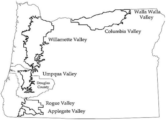 The spatial depiction of Oregon’s American Viticultural Areas (AVAs). (Adapted from [10], with permission from Jones, 2004).