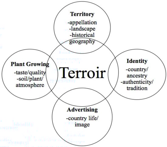 Vaudour characterized viticultural terroir (grape growing), as four components: plant growing, territory, advertising, and identity (Figure 2) [32]. The plant growing terroir is based on the notion that the quality of agricultural products is related to the agronomic properties of a farmed environment. The territory aspect of terroir, which is expressed in Europe through appellation systems and over time becomes a historical geography—think, for instance, of the storied wines from Burgundy or Bordeaux—has been examined in this investigation within Oregon, an organic wine production region.
