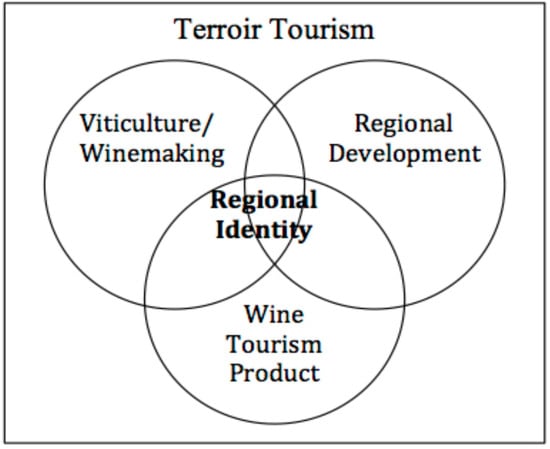 Holland et al. developed a framework of terroir tourism with regional development, wine tourism product and viticulture and winemaking components to form regional identity (Figure 3) [33]. Moran [34] suggests that the importance of human involvement should be factored into crafting terroir at the holistic level as well: “Great wines…are created by people understanding where they work and expressing its qualities quality in their product” [35]. The geographical characteristics of terroir and associated human interaction together construct the cultural landscape of the locality (place or region)—a set of conditions for producing high-quality culinary products with creative and artistic characteristics of the place (place identity and image), which reflect their place of origin [36]. To capitalize on these characteristics, terroir can be and is often used in marketing as an image for a winegrowing region [37]. A scientific approach to researching the characteristics of terroir tourism will also develop on previous experiments that have clearly shown that numerous aspects of terroir can be specified [38]. As suggested by Jones [38], Marlowe and Lee share that territory is most closely characterized in the literature investigating terroir and tourism together [2]. Their findings indicate that territory terms such as a region, land, and place are relevant keywords to reveal the characteristics of terroir tourism. The strongest terroir tourism characteristic is, therefore, the territory within a place, giving it distinctive destination quality and is not simply the wine region as a whole [2].