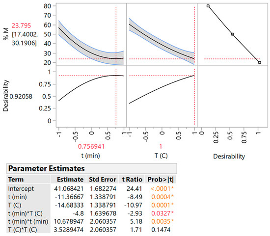 Through the desirability function (Figure 1), the theoretical minimum moisture value was determined to be 23.8 ± 6.4%, achieved by setting t = 8.27 h and T = 70 °C. Model validation included the performance of PP drying under optimised conditions in triplicate and yielded an average moisture value of 24.3 ± 4.8%, which was practically equal to the minimum predicted one. Furthermore, to investigate the effect of higher temperatures on the moisture levels at the optimal t, drying was also repeated at 75, 80 and 85 °C, giving corresponding moisture of 9.0, 3.4 and 2.6%.