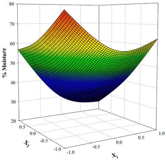 As can be observed, the model was highly significant, suggesting that the mathematical Equation (5) may be reliably used to predict moisture levels. The 3D plot derived by using the predicted moisture values (Figure 2) gives an at-a-glance picture of the effect of the independent variables (t, T) on the response (% moisture).