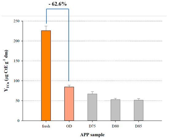 The visualised outcome was also given as a 3D plot (Figure 3). When the optimal drying conditions (t = 8.27 h and T = 70 °C) were used in Equation (6), the predicted YTCn was 84.57 ± 8.56 μg CtE g−1 dm. This value was confirmed by carrying out three runs under the same conditions, which gave YTCn of 86.42 ± 7.32 μg CtE g−1 dm. To obtain a picture regarding the magnitude of the effect of drying on the carotenoid content in PP, a fresh sample was also analysed for YTCn. As can be seen in Figure 4, drying under optimal conditions provoked a decrease in YTCn almost by 63%. Drying for the same period (8.25 h) at 75, 80 and 85 °C, gave corresponding YTCn reduction by 71.2%, 75.6% and 77.2%. This finding pointed strongly to a severe effect of temperature on APP carotenoids.