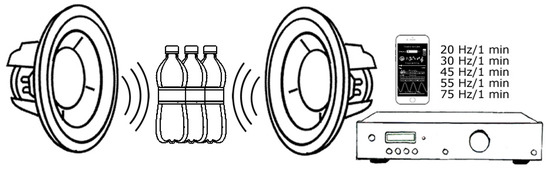Samples used in this study consisted of two treatments: (i) control and (ii) treated with audible sound of three different commercial brands of carbonated water (n = 6; Table 1). The sonication was applied to three 500 mL polyethylene terephthalate (PET) bottles from each brand at refrigeration temperature (4 °C) and consisted of treating the unopened bottles with five different frequencies, 20 Hz, 30 Hz, 45 Hz, 55 Hz, and 75 Hz, for one minute each [13]. As shown in Figure 1, the sonication treatment was applied using two sub-woofers Response CW2199 (Jaycar Electronics, Sydney, NSW, USA)—resistance: 8 Ω, RMS power: 225 W, diameter: 12′′ maximum decibels: 90 dB, maximum power: 450 W—connected to a DigiTech AA0479 amplifier (DigiTech, Sandy, UT, USA) and controlled with the Audio Function Generator application available in the App Store (Thomas Gruber) using an iPhone 5s (Apple Inc., Cupertino, CA, USA). All frequencies were applied in stereo mode using the same volume in both subwoofers and −4 dB of amplitude. There was a distance of 15 cm between the bottle and each subwoofer.