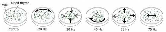Frequencies were selected from a range from 20 to 100 Hz by applying them to milk in a petri dish with dry thyme leaves as particles to observe movements. Videos were recorded and magnified using the Eulerian magnification algorithm [14] for movement detection with Matlab® R2019a (Mathworks, Inc., Natick, MA, USA). Frequencies that generated movement of the particles in different directions were chosen. These movements are shown in Figure 2. All frequencies were tested in stereo mode using the same volume in both subwoofers and −4 dB of amplitude.
