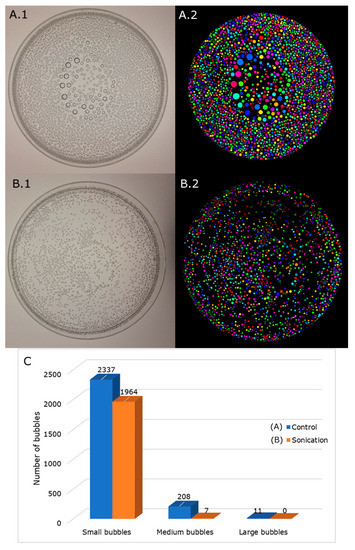 There are a few published studies related to bubble size modification in carbonated water [11,12]. However, the methods presented in those studies involve gas injection to alter the size, which would not be applicable for carbonated waters from natural sources. Gonzalez Viejo et al. [13] have studied the effects of audible sound (low-frequency sonication) in beer both during fermentation and natural carbonation stages to improve foam-related parameters. The main result was a significant reduction in bubble size. However, the source of the effects was not investigated, which means that it did not specify whether the bubble size alteration was due to changes in yeast activity, to physical effects or both.