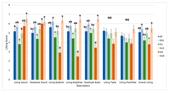 Figure 5 shows the means and results of the ANOVA of the self-reported responses from consumers for the different sensory descriptors. There were significant differences between samples for all attributes, except for liking of taste and mouthfeel. Samples Ice and IceS, and Nu and NuS presented significant differences in most of the descriptors; however, SP and SPS did not have significant differences for any descriptor. For all descriptors, samples with sonication treatment had higher liking and face scale scores than the control.