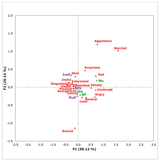 Figure 6 shows the correspondence analysis for the emotion-terms selection, factor 1 (F1) represented 50% of data, while F2 accounted for 25%, representing 75% of total data variability. In this figure, it can be observed that NuS and SP were more associated with terms such as Calm and Neutral, while SPS and Ice are more associated with Pleased, Energetic and Loving, and IceS was related mainly with Glad, Joyful and Interested. On the other hand, Nu, which is separated from the other samples, was related to negative terms such as Sad, Worried, and Contempt.