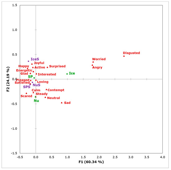Figure 7 shows the correspondence analysis for the visual assessment in which F1 and F2 represent a total of 85% of data variability (F1 = 60.3%; F2 = 24.2%). It can be observed that Nu was more associated with terms such as Steady and Scared, while SPS and NuS were more related to Satisfied and Pleased and SP to Loving and Interested. IceS was more associated with Joyful, Happy, and Active. On the other hand, Ice is separated from all other samples and more associated with negative terms such as Disgusted, Worried, and Angry.