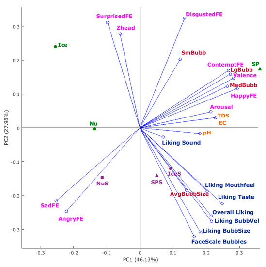 Figure 8 shows the PCA using all sensory, facial expressions, and physicochemical responses. Principal components one and two explained a total of 74% (PC1 = 46%; PC2 = 28%). According to the factor loadings (FL) found in supplementary material (Table S1), PC1 was mainly represented by HappyFE (FL = 0.29) and Valence (FL = 0.28) on the positive side of the axis, and SadFE (FL = −0.25) and AngryFE (FL = −0.22) on the negative side. On the other hand, PC2 was mainly represented by DisgustedFE (FL = 0.33) and SurprisedFE (FL = 0.31) on the positive side and Liking BubbSize (FL = −0.31) and FaceScale Bubbles (FL = −0.32) on the negative side of the axis. It can be observed that AvgBubbSize was positively related to Liking BubbVel and overall liking, and these three descriptors were negatively related to SurprisedFE and ZHead. The number of medium bubbles was positively related to HappyFE and valence, while number of large bubbles had a positive relationship with valence and ContemptFE. Both medium and large bubbles had a negative relationship with SadFE and AngryFE. Number of small bubbles had a positive relationship with DisgustedFE and negative with AngryFE. Results from TDS and EC are positively related to arousal, while pH was positively related to Liking Sound. Samples SPS and IceS were more associated with Liking and FaceScale of sensory descriptors as well as AvgBubbSize, while NuS was more related to AngyFE and SadFE. SP was associated with Valence, ContemptFE and medium and large bubbles, while Ice was more related to SurprisedFE and ZHead. On the other hand, Nu is not positively associated with any parameters but is negatively related to pH, TDS, EC, and arousal.