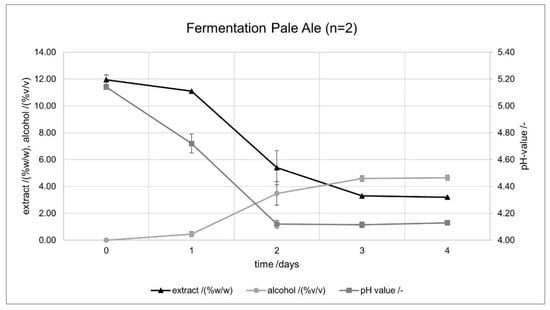 Curvature of extract/(%w/w), pH value/-, and alcohol content/(%v/v) during pale ale fermentation (n = 2). The error indicators in the figures represent the standard deviation.