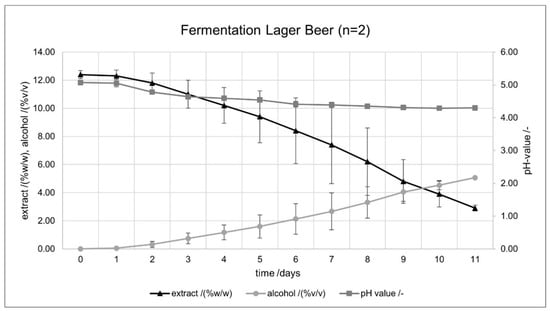 Curvature of extract/(%w/w), pH value/-, and alcohol content/(%v/v) during lager beer fermentation (n = 2). The error indicators in the figures represent the standard deviation.