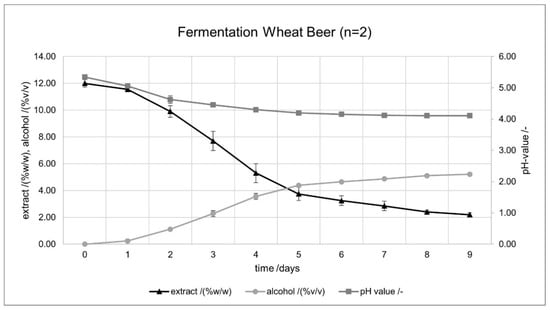 Curvature of extract/(%w/w), pH value/-, and alcohol content/(%v/v) during wheat beer fermentation (n = 2). The error indicators in the figures represent the standard deviation.