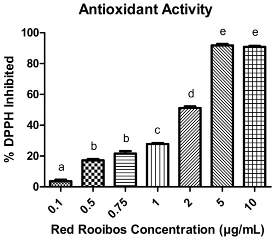 Ability of varying red rooibos (RR) tea polyphenols to function as antioxidants and inhibit the free radical DPPH. Error bars are ± SEM, n = 5. Differing letters indicates a significant difference (p < 0.05) among rooibos concentrations.