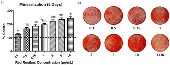 Influence of RR tea polyphenol concentration on mineralization. (a) Mineralization after 5 days in the presence or absence of RR tea polyphenols; error bars are ± SEM, n = 5 (each sample was the resulting average of three wells). CON = control. * indicates a significant difference (p < 0.05) between rooibos concentration and control, while differing letters indicate a significant difference (p < 0.05) among concentrations. (b) Images of representative alizarin red stain showing mineralization.