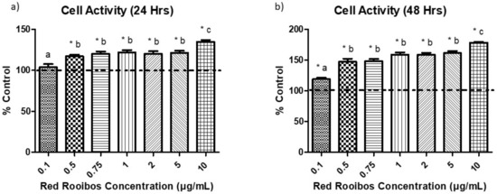 Cell activity following exposure to varying concentrations of RR tea polyphenols for (a) 24 h; and (b) 48 h. Quantity of MTT (3-(4,5-dimethylthiazol-2-yl)-2,5-diphenyltetrazolium bromide) reduced to formazan crystals expressed as % of control. Error bars are ±SEM, n = 12. CON = control. * indicates a significant difference (p < 0.05) between rooibos concentration and control, while differing letters indicate a significant difference (p < 0.05) among concentrations.