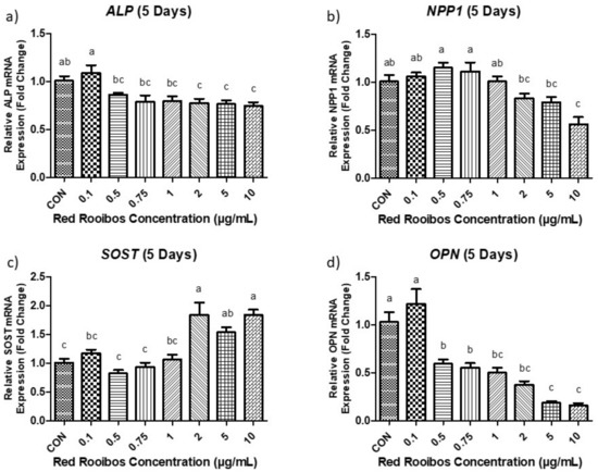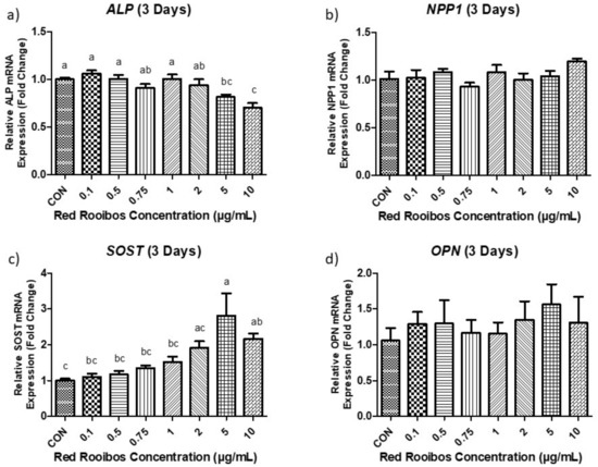 After 3 days of mineralization there were no differences in ALP expression between cells that were exposed to lower concentrations of RR tea (≤ 2 µg/mL of polyphenols) and the control vehicle (dH2O). However, at concentrations ≥ 5 µg/mL or higher there is a statistically significant (p < 0.05) decrease in ALP (ALPL) expression (Figure 4a). NPP1 (ENPP1) expression remained similar between all conditions regardless of RR tea concentration (Figure 4b). SOST remained unchanged at lower concentrations (≤ 2 µg/mL) but expression was significantly (p < 0.05) increased, when supplemented with higher concentrations of RR tea (≥ 5 µg/mL of polyphenols) relative to cells treated with control vehicle (Figure 4c). Levels of OPN (SPP1) expression were similar across all concentrations after 3 days of mineralization with no statistical differences among them (p < 0.05) (Figure 4d).