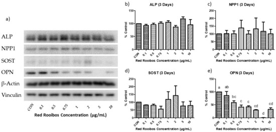 Three days into the mineralization process, protein expression remained mostly unchanged when compared to control with the exception of OPN (Figure 6a). More specifically, there were no observed differences in ALP, NPP1, and SOST (Figure 6b–d); while OPN was significantly reduced at RR tea concentrations ≥ 0.5 µg/mL of polyphenols when compared to control (Figure 6e).