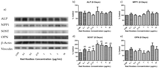 Protein expression following 5 days of mineralization. (a) representative western blot analysis of the influence of red rooibos polyphenols on Saos-2 cells. Densitometric analysis of (b) ALP; (c) NPP1; (d) SOST; and (e) OPN protein expression. Values are normalized to reference protein (Vinculin; ALP, OPN, SOST and β-actin: NPP1) and presented as % of control with error bars ± SEM, n = 3. Differing letters indicate a significant difference (p < 0.05) among conditions.