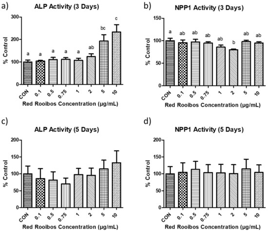 The specific activity of ALP and NPP1, key proteins involved in the mineralization process by osteoblasts, were investigated following 3 and 5 days of mineralization. Following 3 days of mineralization the activity of both ALP and NPP1 significantly differed from the control in response to RR tea. Concentrations of RR tea at concentrations ≤ 2 µg/mL of polyphenols elicited similar ALP activity than cells which had received a volume control. While concentrations ≥ 5 µg/mL resulted in significantly (p < 0.05) elevated activity (Figure 8a). In terms of NPP1, RR tea resulted in little alteration to activity when compared to control with the exception of cells receiving 2 µg/mL which demonstrated a significantly reduced activity after 3 days of mineralization (p < 0.05) (Figure 8b). Following 5 days of mineralization the activity of ALP and NPP1 were similar among groups regardless of RR concentration (Figure 8c,d).