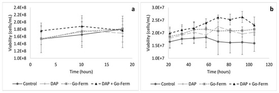 There were no significant differences between treatments for viable cell concentration during the adaptation stage 2 of cell acclimatization (Figure 2a). During the proliferation stage 3, DAP (T2) and GF (T3) treatments reached viable cell concentrations at 69, 71, 93 and 105 h that were significantly higher than the control (p < 0.05) while the combined DAP + GF (T4) treatment reached viable cell concentrations significantly greater than all treatments for these time points (p < 0.05) (Figure 2b). Supplementing yeast with DAP (T2) stimulated cell growth, providing them with a source of easily usable ammonia nitrogen [28,29]. The DAP supplemented yeast required 69 h to reach a viable cell concentration that was significantly higher than the control (p < 0.05) (Figure 2b). The extended period of time required for the DAP supplement to impact the viable cell concentration later in stage 3 may be due to the yeast acclimatization procedure beginning with a high viable cell concentration [1]. It has previously been shown that there is a maximum viable cell concentration attainable in a tirage (acclimatization) medium. A tirage inoculated with 12 g/L ADY typically leads to marginal growth during adaptation in stage 2 and one doubling during the proliferation stage 3 [1]. For this experiment, the quantity of yeast rehydrated and added to stage 2 was equal to a concentration of 33 g/L (Figure 1) whereas the yeast at the start of stage 3 would be further diluted 10-fold. Since the quantity of yeast rehydrated for the acclimatization equaled the maximum cell concentration that the medium could sustain, the culture may have been prevented from significantly increasing its viable cell concentration during stage 2. GF has previously been shown to increase the concentration of viable cells under stressful conditions [3,30]. This observation was supported by our experiments as rehydrating the yeast in GF (T3) led to a higher viable cell concentration at the end of stage 3 in comparison to the control (p < 0.05) (Figure 2b). GF can provide essential micronutrients including zinc, potassium, biotin and thiamine, which have all shown to increase the tolerance of yeast to base wine conditions [3,20]. The viable cell concentration for the acclimatization supplemented with DAP and GF (T4) was significantly higher than all other treatments for most of the proliferation stage (stage 3) (p < 0.05) (Figure 2b). The decrease in the viable cell concentration at the end of the acclimatization steps may be due to the yeast exhausting its supply of fermentable sugars (Figure 3b). Cell viability was higher for the DAP + GF treatment than the control at 105 h but not significantly different from the GF or DAP treatments (p < 0.05).