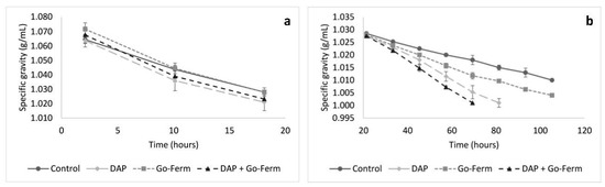 All nutrient supplements had a similar but faster rate of sugar consumption during the adaptation stage 2 compared to the control (Figure 3a, Table 3). However, the rate of sugar consumption varied significantly (p < 0.05) during the proliferation stage 3 depending on the treatment (Figure 3b, Table 3). The DAP + GF (T4) treatment stimulated sugar consumption the greatest, allowing cells to reach the target specific gravity below 1.010 in only 57 h, signaling the end of stage 3 (Figure 3b). DAP alone (T2) showed the next fastest sugar consumption rate reaching the specific gravity target in 69 h, followed by GF (T3) in 81 h with the control requiring 105 h to reach this target, with a sugar consumption rate half that found for the DAP + GF (T4) treatment (Figure 3b, Table 3). The rate of sugar consumption was slower for the acclimatization supplemented only with GF than the one supplemented only with DAP, likely due to differences in nitrogen composition and quantity. Contrary to what was observed for cell growth, DAP had an immediate impact on the rate of sugar consumption, indicating that at the cell concentrations observed during yeast acclimatization, ammonia impacts the rate of sugar consumption more than stimulates cell growth (Figure 2 versus Figure 3).