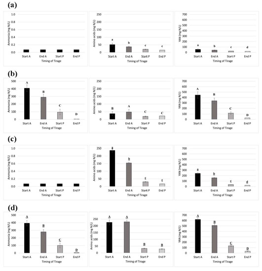Nitrogen concentration during the stages of yeast acclimatization in the form of ammonia nitrogen (column 1), amino acid nitrogen (column 2) and Total YAN (column 3), all reported as mg N/L. Nitrogen from ammonia and amino acids were determined at the start (Start A) and end (End A) of adaptation stage 2 and the start (Start P) and end (End P) of proliferation stage 3 for all four treatments. Total YAN is the addition of ammonia and amino acid nitrogen. Treatments were: T1 control, panel (a); T2 DAP addition, panel (b); T3 Go-Ferm® addition, panel (c); and T4 DAP + Go-Ferm® addition, panel (d). Due to low ammonia levels in T1 and T3, reported at the limit of detection of the kit (0.071 mg N/L), the Y-axis scale for ammonia was resized to range from 0 to 1 mg N/L for panel (a) and (c). All other scales were kept constant between treatments for comparison purposes. Different letters within a treatment for a given nitrogen source refers to significant differences (p < 0.05) in nitrogen concentration between time points as determined by ANOVA with mean separation by Fisher’s Protected (LSD0.05).