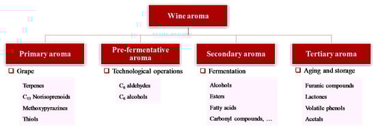 Wine aromas can be organized based on their origin in the production process (Figure 2) into the following: primary aroma, from grape variety; pre-fermentative aroma, produced during the processing of grape; secondary aroma, originated during the fermentation process (e.g., alcoholic, malolactic) by yeast and bacteria; tertiary aroma, derived from transformations that occurred during storage and/or the ageing process [10,14].