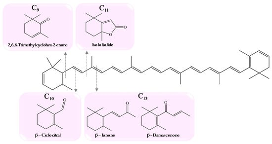 Formation of C9, C10, C11, and C13 norisoprenoids from breakdown of carotenoids [18].