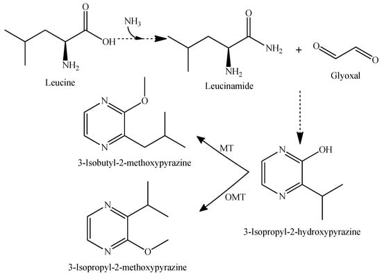 Proposed pathway for the biosynthesis of 3-isobutyl-2-methoxypyrazine and 3-isopropyl-2-methoxypyrazine [47,48]. MT, methyltransferase; OMT, O-methyltransferase.
