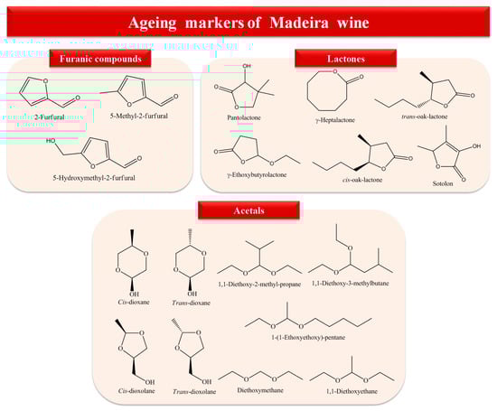 Tertiary aroma, also known as ageing/bouquet aroma, is produced after the fermentation process, that is, during wine ageing (wood barrel, bottle ageing) [77,78], which is attended by changes of the organoleptic properties. Wine ageing bouquet is a result of chemical reactions including ester hydrolysis and formation, oxidation, and cyclization [79]. Hydrolysis of glycosidic precursors as well as chemical rearrangements of some VOCs arising from grapes or fermentation are hypothetical crucial phenomena associated with aged wine aroma development [79]. The quality of the ageing bouquet depends on the wine origin (e.g., vineyard soil, microclimate), vintage (reflecting the climatic conditions of the year of production) [78], and diffusion of molecules from the oak to wine, which depends on the oak characteristics (e.g., geographical origin, species of oak, seasoning of the staves, toasting, cask age) [80,81], among others. During the ageing process, the concentration of some varietal and fermentative aroma compounds decreases, allowing the wine to lose its freshness and fruitiness, whereas other odors, namely, caramel, dried fruits, spicy, toasty, and woody odors, appear. The Maillard reactions and diffusion from the oak are the crucial pathways related to these descriptors [4,29]. The furanic compounds, lactones, volatile phenols, and acetals are the main chemical families that have been described as potential ageing markers in Madeira wines (Figure 5) [57,58,77,80,82].