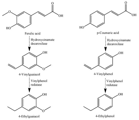 The volatile phenols, like ethyl and vinylphenols, were also released from oak; nonetheless, their microbiological yeast transformation (e.g., Brettanomyces and Dekkara) from hydroxycinnamic acids of wine is described as the main source [96]. Figure 6 shows the ethylphenols’ formation from hydroxycinnamic precursors by yeasts’ transformation [97].
