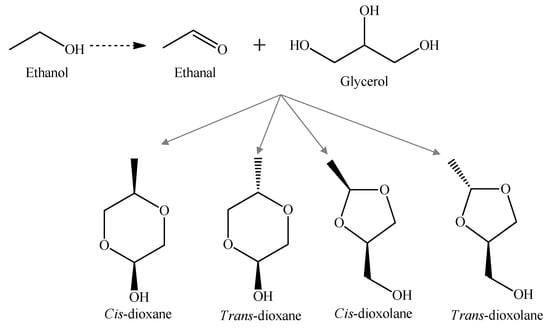 The acetals arose by the acid-catalyzed condensation reaction between aldehydes and alcohols, which is favored at higher pH values, resulting in four heterocyclic acetal alcohol formation: cis- and trans-5-hydroxy-2-methyl-1,3-dioxane (cis- and trans-dioxane), and cis- and trans-4-hydroxymethyl-2-methyl-1,3-dioxalane (cis- and trans-dioxolane); Figure 7 [82,102].