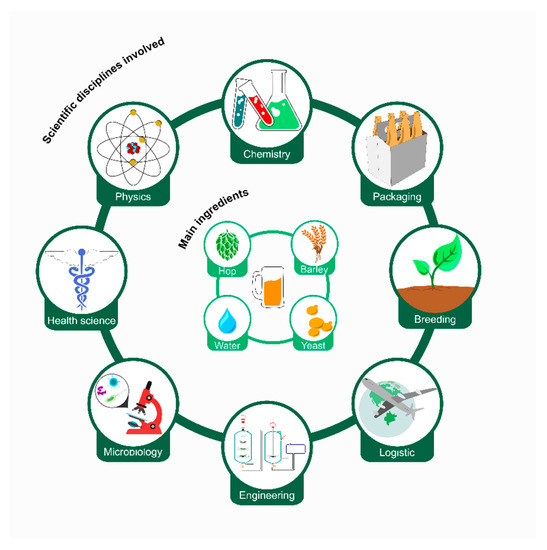 Human history is woven with brewing activity ever since the beginning of civilization in the Neolithic period [1,2,3]. Nowadays, the productive process includes basically the phases of malting, in which cereals (mainly barley) are converted in malt; mashing, that permits to obtain wort; and fermentation, that finally generates beer. Looking at the productive process, beer appears to be a highly consolidated and sufficiently known product. This consideration is, however, disproved thinking of all the sciences behind the brewing process: Microbiology, chemistry, agronomy, but even logistic, marketing, process engineering, and health science cooperate to obtain high-quality and versatile products competitive on the market (Figure 1).
