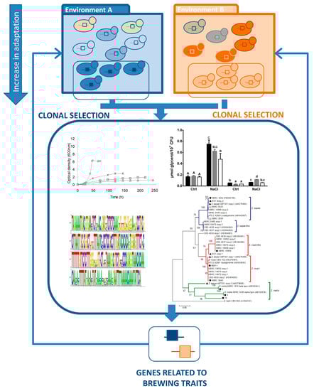 Marker-assisted selection of natural variants harboring brewing relevant traits. Clonal selection provides the best adapted candidates for brewing, while genomics and phenomics outline the map of loci responsible for brewing characteristics. This information, in turn, can be used to improve the selection of novel powerful and costumed-designed candidates. Letters on the columns represent statistical significance.