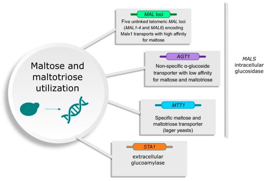 - Dietvorst, J.; Londesborough, J.; Steensma, H.Y. Maltotriose utilization by lager yeast strains: MTT1 encodes a maltotriose transporter. Yeast 2005, 22, 775–788. [Google Scholar] [CrossRef]