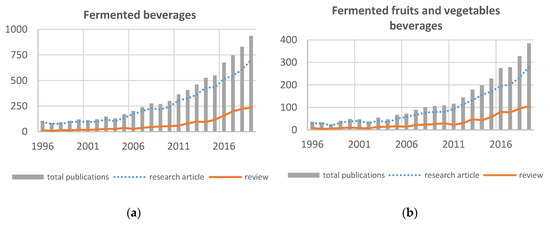 We explored the scientific literature on fermented beverages by bibliometrics on the Science Direct database to quantify the interest for this topic during the last 20 years. A low number of scientific publications for fermented beverages until 2005 (Figure 1) was observed, but then the interest in exploration of this process was progressively and noticeably growing. The topic exceeded the threshold of 250 original research articles per year in 2011, 500 in 2016, and is now above 700 while the count reached 937 for the total publications. A focus on fruit and vegetable fermented beverages showed a moderate scientific production reaching only 100 original research articles per year in 2012 but then the number of publications was doubled in 2017 and is now 384 for the total publications.