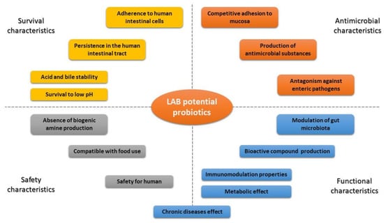 The LAB population in recently developed lactic fermented fruit or vegetable juices was above the limit of 6–7 log CFU/mL, required for probiotic products, at the end of fermentation and even after a storage period of fruit and vegetable beverages. The criteria for a LAB to be used as probiotic include the abilities to withstand into a foodstuff at high cell counts, and remain viable throughout the shelf-life of the product; be nonpathogenic and nontoxic; withstand transit through the GI tract; adhere to the intestinal epithelium cell lining and colonize the lumen of the tract; produce antimicrobial substances towards pathogens; stabilize the intestinal microflora and be associated with health benefits [152]. Basic relevant criteria for LAB selection to develop functional fruit and vegetable beverages are resumed in Figure 2. Scientific investigation has supported the important role of probiotics as a part of a healthy diet for human as well as for animals. Some of the beneficial effects of LAB consumption include improving intestinal tract health; enhancing the immune system; synthesizing and enhancing the bioavailability of nutrients; reducing risk of certain cancers and cardiovascular diseases [152,153,154,155]. Therefore, LAB use is of interest for functional food development.