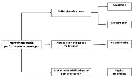 - Cold-adaptation [35]: Probiotics and/or starter strains are cultured at suboptimal temperatures (15–20 °C), thus increasing their technological performances in food;