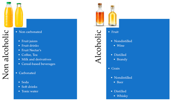 By definition, beverages are potable liquids for human consumption, which are essential for many physiological functions, such as giving energy and refreshing the body [1]. In general terms, “beverages” include many different products, such as milk, coffee, tea, juices, and alcoholic products, which humans commonly consume in their daily lives [2,3,4,5,6,7]. In agreement with recent literature [8,9,10], the most frequent drinks currently used in the human diet can be classified into two categories: Alcoholic and non-alcoholic beverages. A brief classification of beverages is shown in Figure 1.