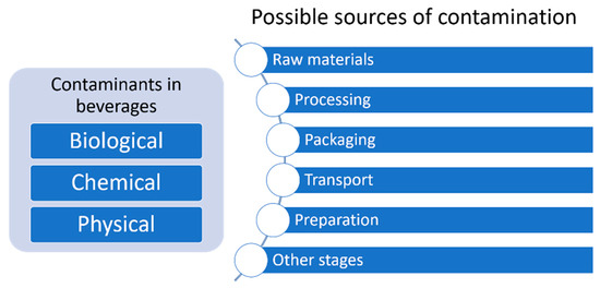 The term “contaminants” in beverages includes those compounds that are dangerous to health, whether chemical, physical, or microorganisms. Potential contamination is one of the main issues for consumers when selecting beverages for their use, as it could represent a risk for their health and well-being [16]. Although chemical and biological contaminants are strictly banned in beverages formulation, they can sometimes be unintentionally formed during processing, packaging, and distribution processes. In addition, physical contaminants such as foreign bodies that may be present in beverages must be taken into account (glass, wood, metal fragments, etc.). These may come from raw materials, but also from unintentional contamination from personnel or devices used during the processing and packing of the final product [14].