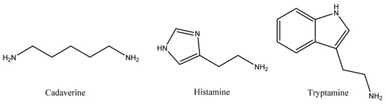 Biogenic amines (BAs) are basic compounds that are synthesized through some metabolic routes. They are minor constituents of non-fermented raw materials for beverages at low concentrations. Nevertheless, large quantities of these amines have been occasionally detected in specific cases in both beverages and fermented food as a consequence of the presence of contaminating microflora. Therefore, BAs have been traditionally employed as indicators of the sanitary quality of beverages by their microbiota alteration. The chemical structure of the main BAs can be aliphatic, aromatic, or heterocyclic [49] (Figure 3).