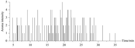 The sensory evaluation of Xiaoqu liquor was performed according to previous studies [8,9] and EN ISO 8589 “Sensory Analysis General Guidance for the Design of Test Rooms”. The sensory evaluation panel was composed by 10 professional liquor tasters (among which five are national level liquor tasters) selected from Jing Brand Co. Ltd. A series of standard solutions of different aromas at different intensities were prepared. The panelists were then invited to examine the aroma one by one. The intensity (quality or time of duration) was evaluated by the panel or individual panelists with a five-grade marking system, and the description methods are presented in Table 1. Subsequently, the descriptors of the sensory characteristics of Xiaoqu liquor were sorted out, including eight descriptors: fruity, floral, grain, sweet, fermented grain, chaff, sour, and green. The aroma of the liquor samples was described by the panelists after 90 s of olfactory evaluation in a professional liquor tasting room, and the interval between two rounds was 30 min. The panelists would make evaluation of the aroma intensity based on the screened aroma indices, and the average values were taken to plot the aroma profiles.