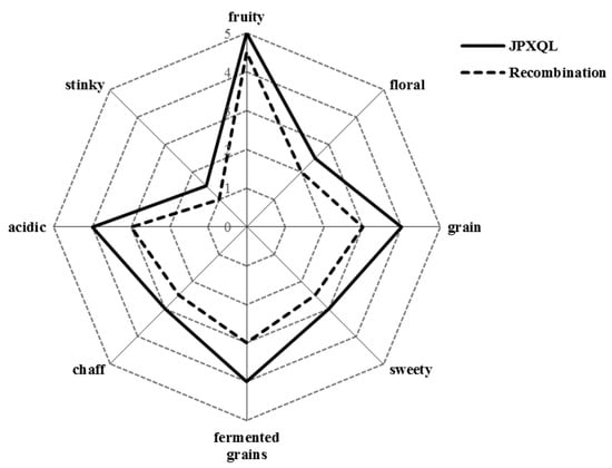 Aroma recombination and omission experiments are general methods to validate the critical aroma compounds [11]. On a quantitative basis, various aroma compounds at different concentrations are added into certain medium to produce an overall aroma [22,23]. In addition, sensory analysis has also been used to study the relationship between flavor substances in the liquor and the liquor flavor. The 32 compounds with OAVs ≥ 1 were recombined, and the aroma was compared with that of the base liquor. Figure 2 shows that the recombination solution had rich aroma, particularly fruity aroma, grain aroma, and distiller’s grain aroma. A comparison of the aroma properties in the original liquor and recombination sample showed that they had highly similar aroma profiles with only very slight differences. These slight differences could be due to that the recombination sample did not undergo the aging process of the original liquor, and the reactions among compounds did not fully occur because of the short time of establishment, or the medium for the recombination did not contain some non-volatile compounds that interact with the aroma compounds. Although there were slight differences in aroma properties between the two samples, the statistical results showed that there were no significant differences in the eight properties analyzed in the aroma profiling, indicating that the simulation system of Xiaoqu liquor was successfully established. These results also imply the high accuracy and reliability of the aroma compound extraction method, AEDA combined with GC-O, quantitative analysis of complementary aroma active compounds, and the method for identifying the key aroma components based on OAV calculation used in this study.