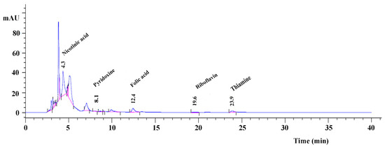 Chromatographic profile of B-vitamins from donkey milk obtained after RP-HPLC analysis (Column: C18 HiQSil HS, 5 μm, 4.6 mm i.d, 250 mm, connected to an Agilent 1260 Infinity LC System, Agilent Technologies).